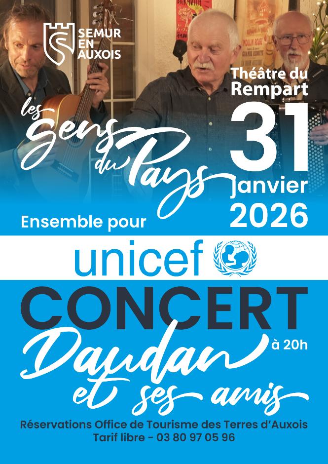 Concert exceptionnel « Daudan et ses amis » le 31 janvier à Semur en Auxois Bonjour à toutes et à tous Voici l’affiche du spectacle Daudan et ses amis, qui a lieu le 31 janvier au théâtre de Semur au profit de l’ Unicef. Les amis présents sur scène sont ses musiciens, la chorale d’Aymeric, Pierre-Yves Bon, Alexandra, ElyjAA , les jeunes de l’atelier théâtre du lycée, et Alain Bouchet à la mise en scène Merci de transmettre cette annonce auprès de vos listes de diffusion. Au plaisir de vous retrouver prochainement. Anne Marie DAUDAN Association René Daudan chante 2, rue de la Liberté, 89160, JULLY